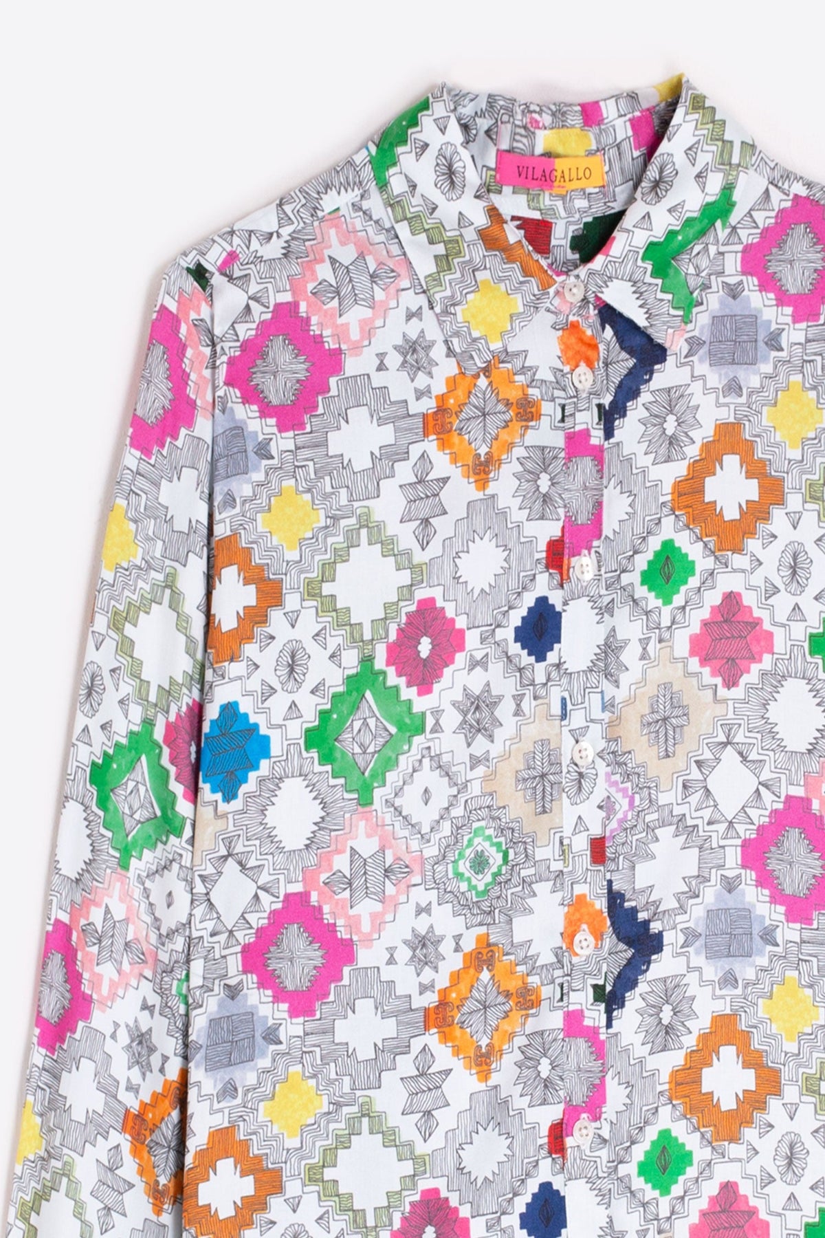 Long-sleeve shirt with vibrant multicolor geometric print over a white base. Classic collar, front button closure and rounded hem. Made of 100% soft viscose with a fluid drape.